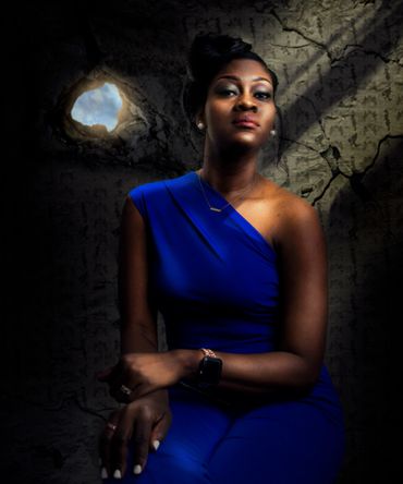 Portrait of a young woman in an elegant black dress sitting in her living room holding balloons